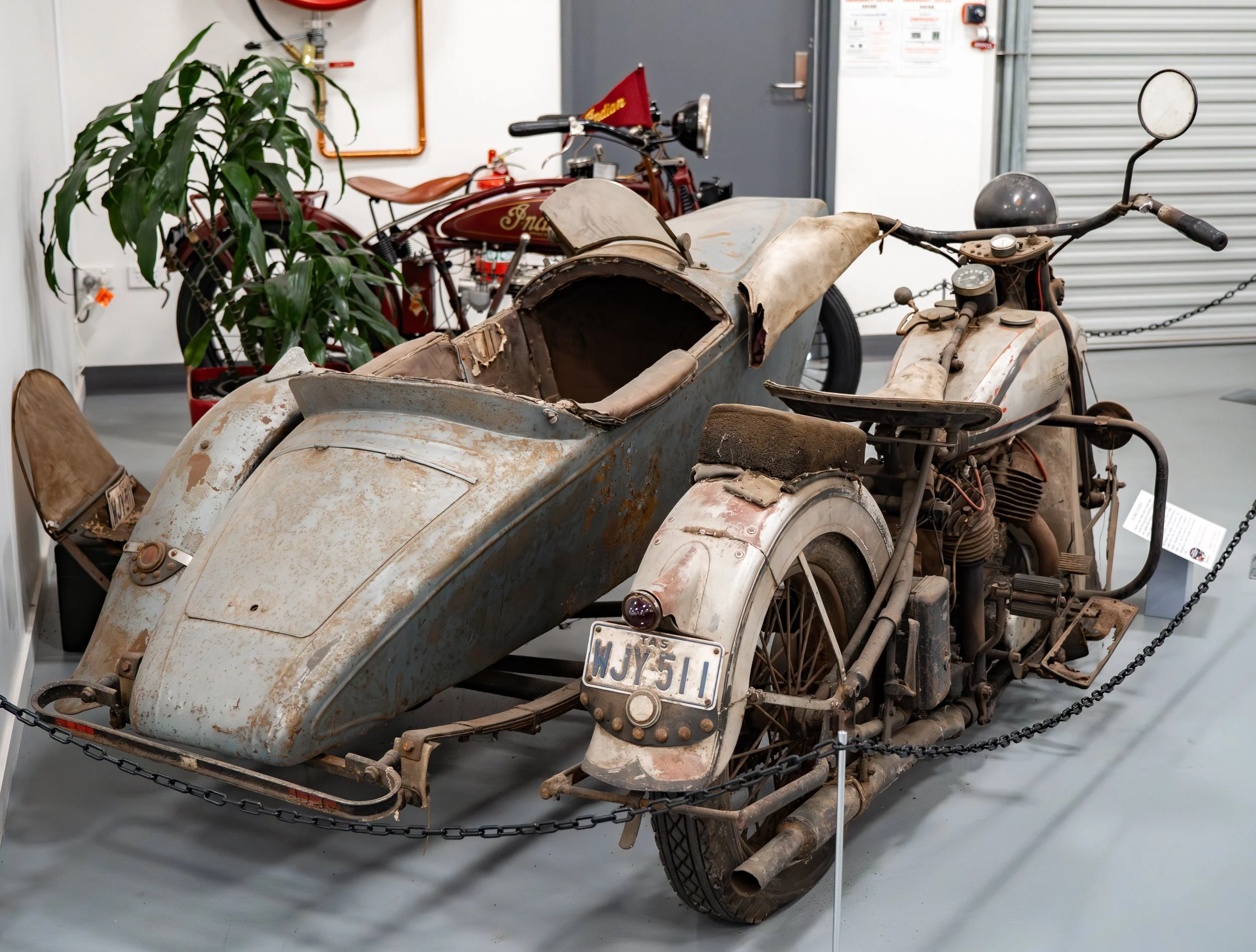 In the late nineteen-twenties, Indian purchased the assets of the ACE motorcycle corporation. Indian proceeded to manufacture the Indian-ACE until 1928 when the Indian Four took its place – designed by Arthur O. Lemon. Despite the low demand for luxury motorcycles during the Great Depression, Indian not only continued production of the Four, but continued to develop the motorcycle. For 1940, the Four frame was modified to include plunger rear suspension. In the same year, all Indian models were restyled with large, decorative fenders. In 1941, the 18-inch wheels of previous models were replaced with 16-inch wheels with balloon tires. The motorcycle on display is powered by a 77-cubic-inch aircooled inline-four, producing 30 horsepower. The Indian Four was discontinued in 1942. The motorcycle on display was privately imported to Australia from Ohio.