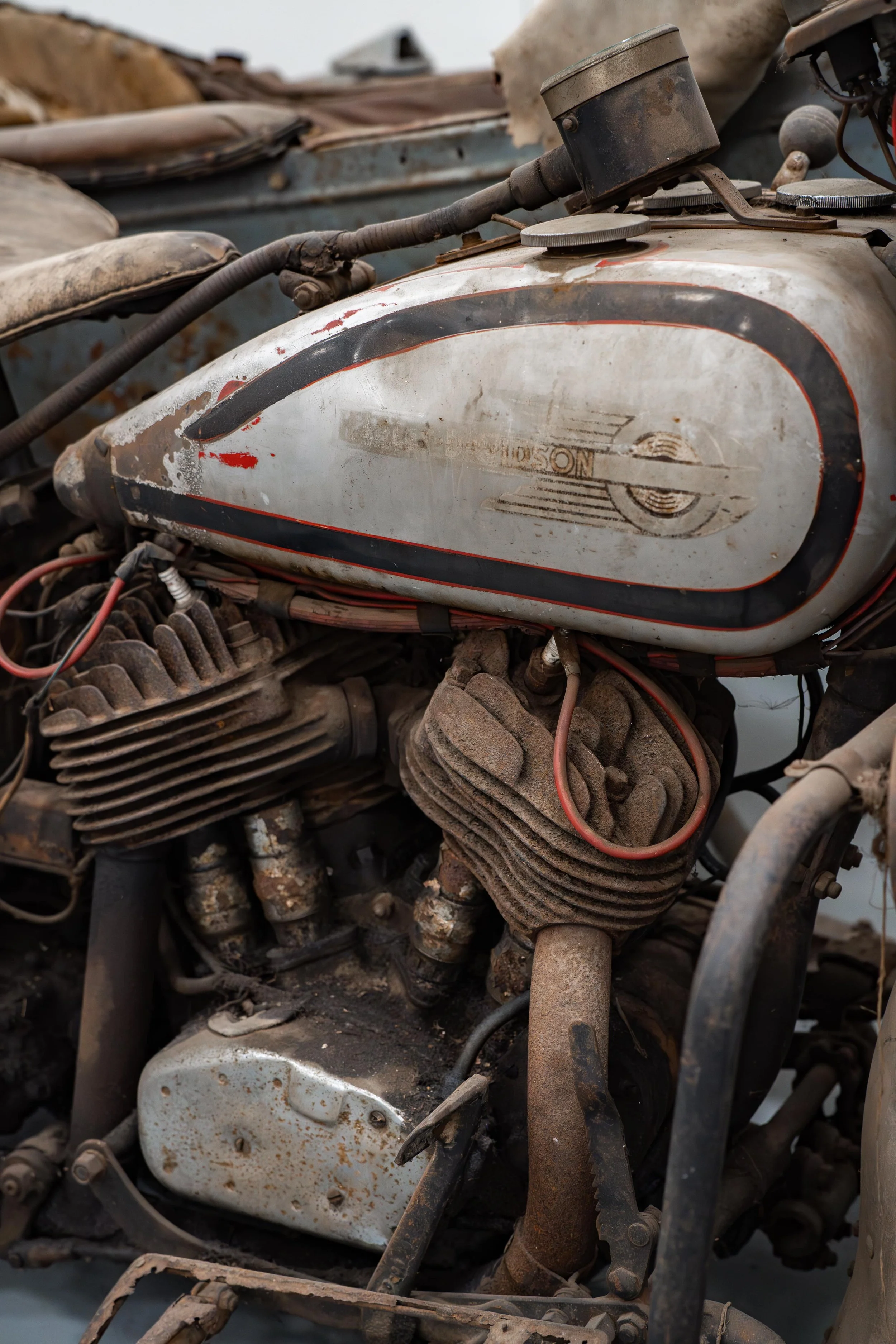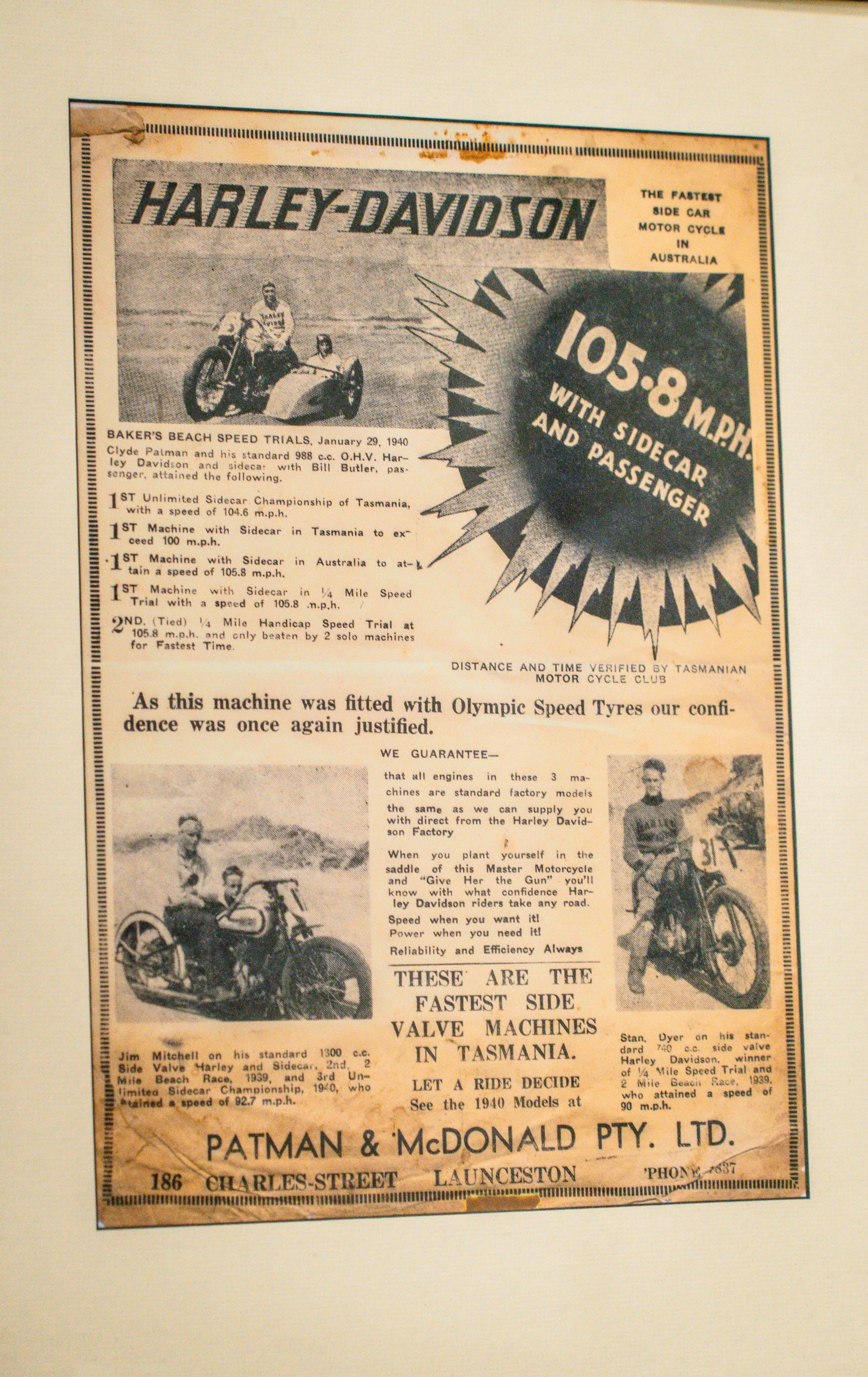 Presented in original unrestored condition, this Harley-Davidson has been with the same owner for the past fifty-five years. Its first owner operated Patman and McDonald, Launceston’s only Harley-Davidson dealer at the time. As shown in the poster, this motorcycle (with sidecar attached) was clocked on 2 Mile Beach at 92.7mph. In 1939, the 74-cubic-inch (1,210cc) VL Flathead replaced the old JD Big Twin. The VL had a single downtube frame and total-loss oiling, culminating in an 80-cubic-inch (1,300cc) version (VLH) in 1935. In 1937, that engine was redesigned to include a recirculating lubrication system, and designated the Model U, and it went into the same frame and running gear configuration as the model E Knucklehead, which had originated in 1936.