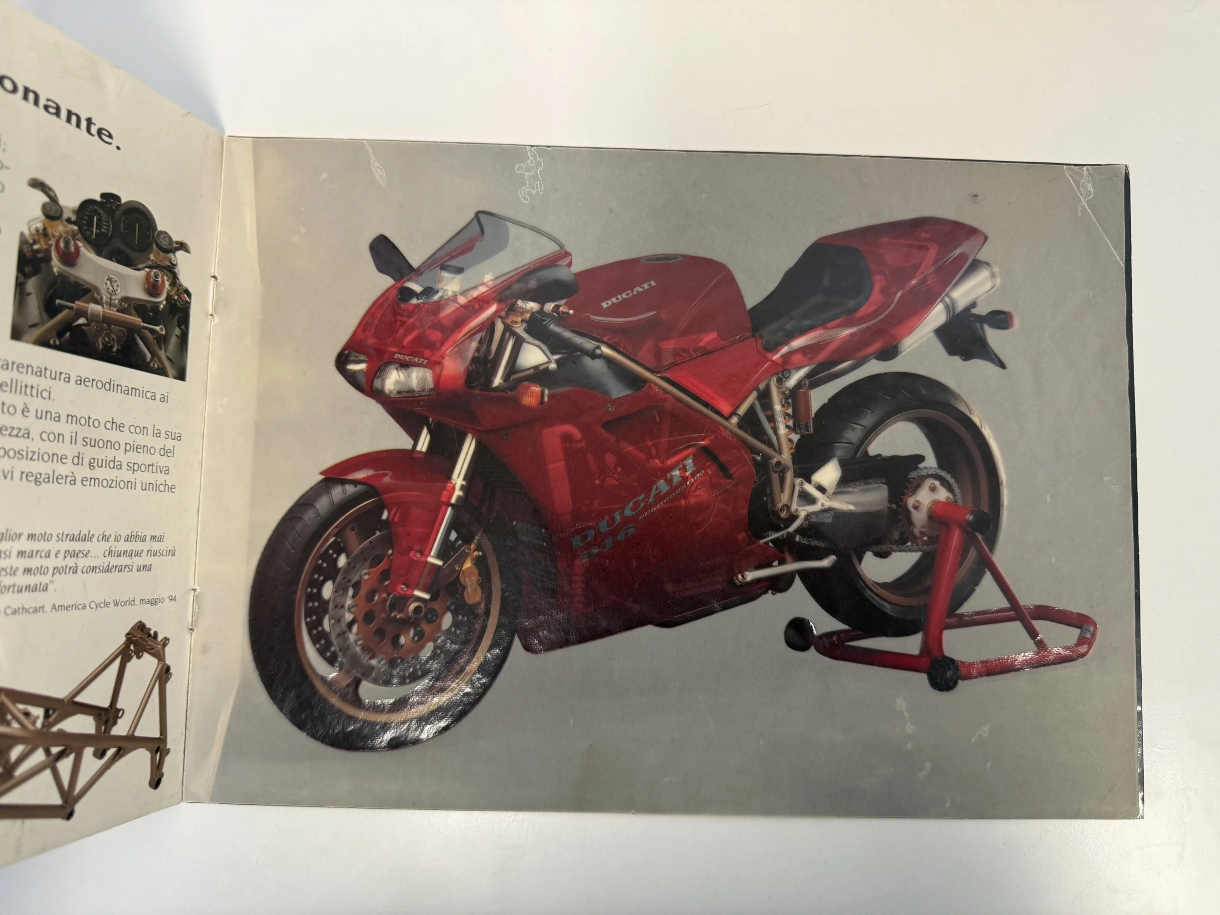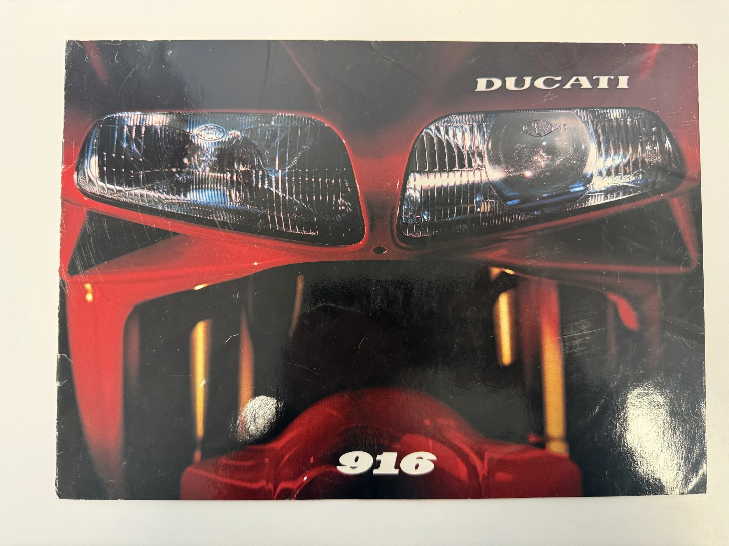 Unique and highly rare Ducati 916 brochure featuring a special cellulose overlay page that reveals the engine beneath the fairing. A standout collector’s piece showcasing innovative design and presentation — a must for Ducati enthusiasts.