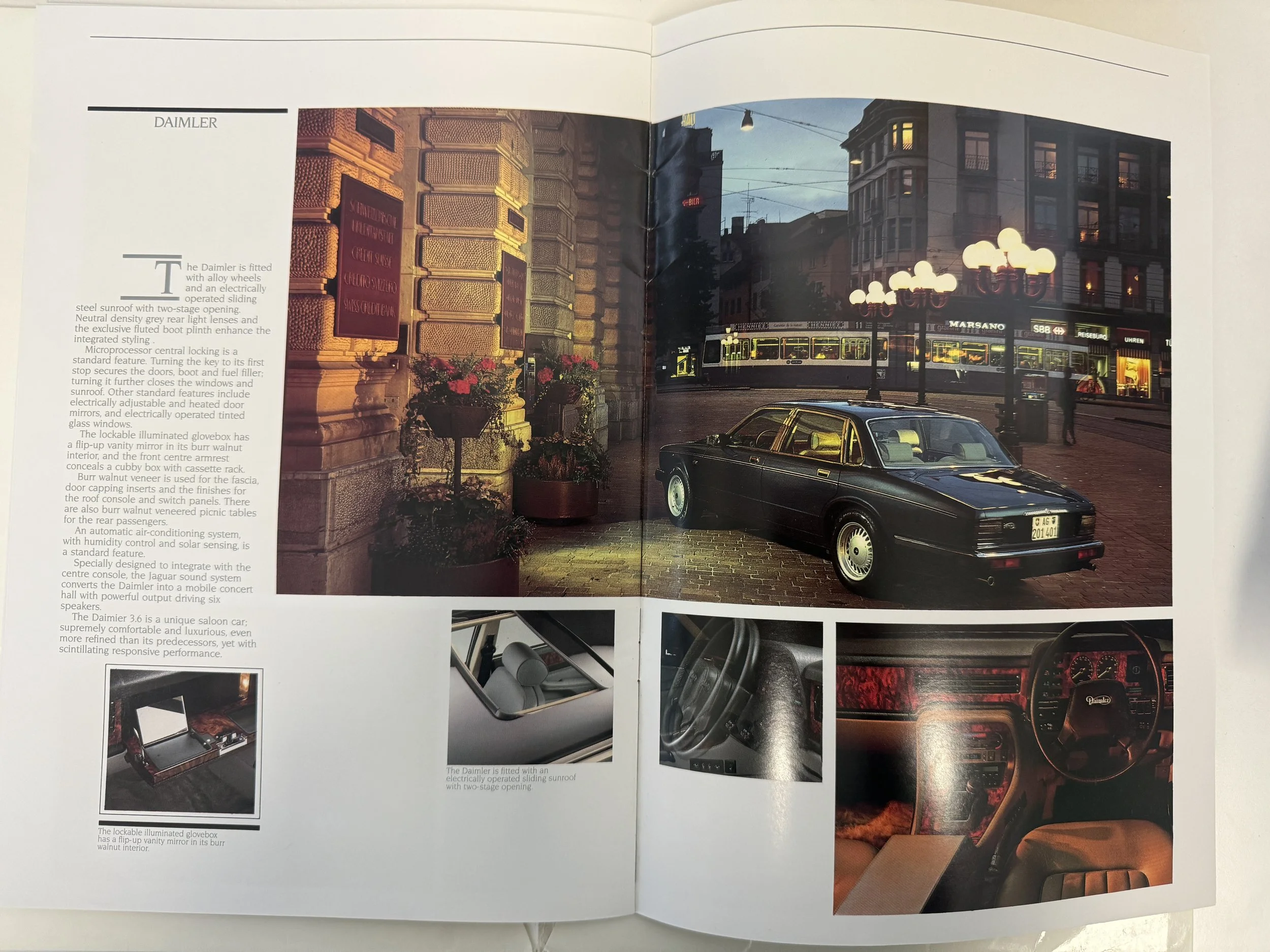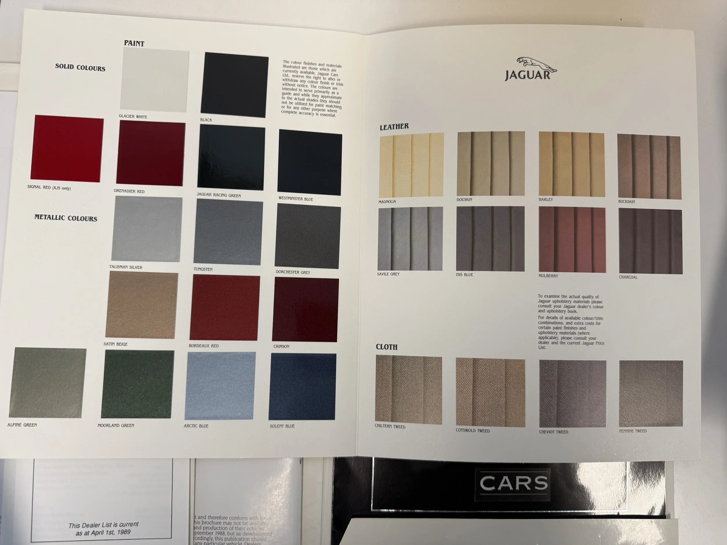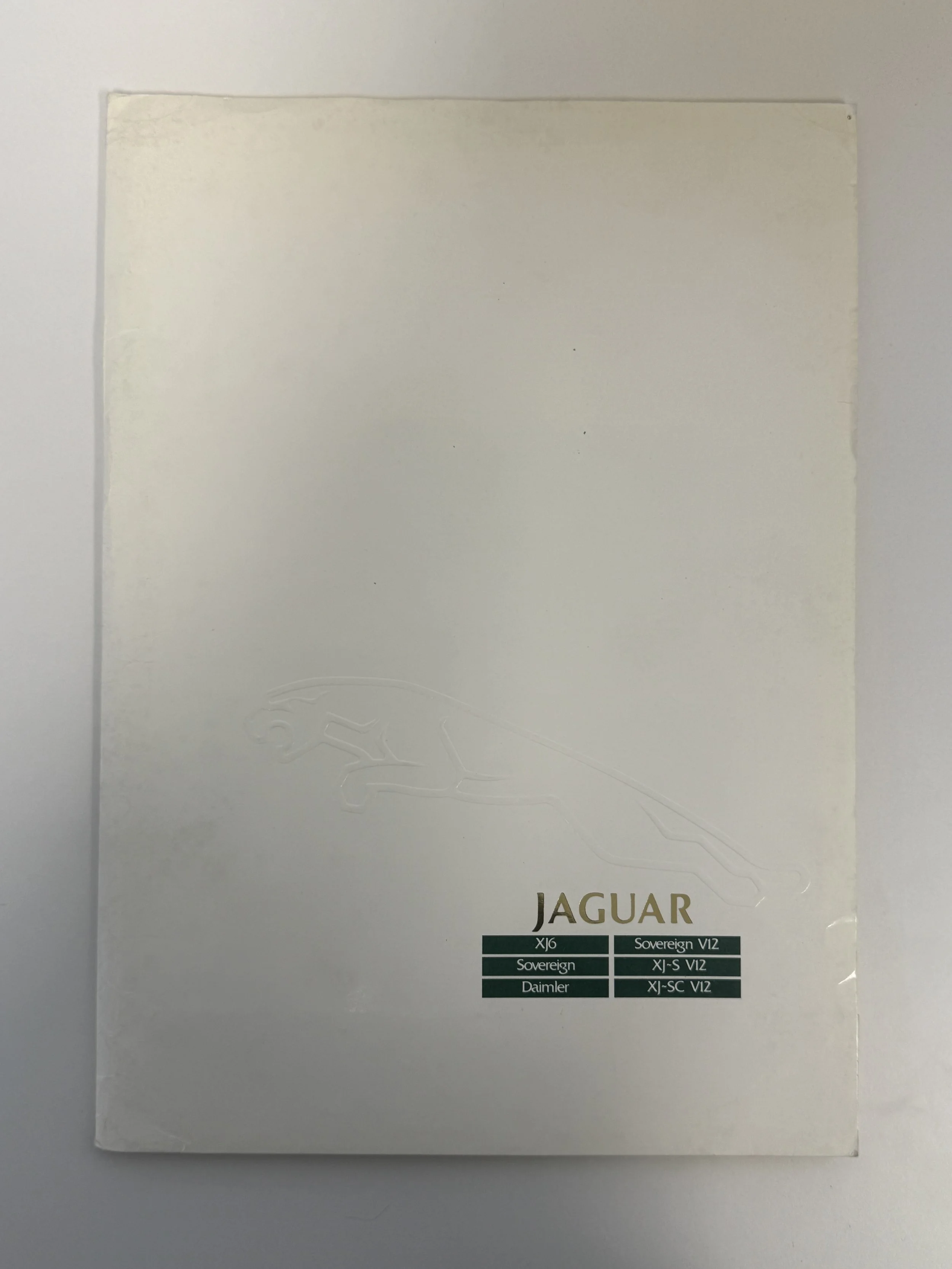 Original 1989 Jaguar sales brochure covering the XJ6, Sovereign, Sovereign V12, Daimler, XJ-S V12, and XJ-SC V12 models. Includes detailed trim information, plus original sales invoice and related documents. A great collector’s set for Jaguar enthusiasts.